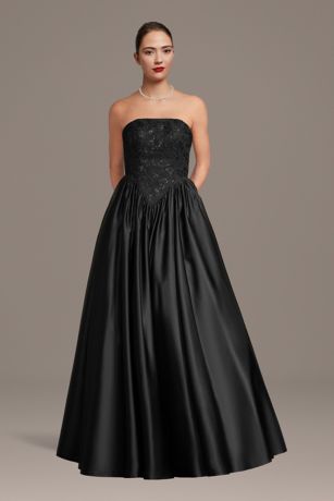 This ball gown features an embellished basque waist bodice with a lace-up back and a flowing satin skirt. Perfect for prom, it combines classic elegance with a showstopping silhouette and optional spaghetti straps.