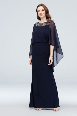 Figure-flattering and oh-so comfortable, this sheath gown features dramatic draped sleeves and ruching at the waist. Try an up-do hair style to show off the elegant illusion neckline, adorned with beautiful beads.