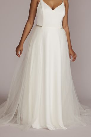 Dress up a bridal jumpsuit or add some volume to your gown with a detachable overskirt. The embellished waistband of this tulle skirt enhances any ensemble.