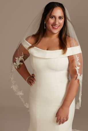 Intricately embroidered flowers, leaves, and scrolling vines wrap around the hem of this fingertip-length veil, with beaded accents filling the petals for a touch of eye-catching glamour.