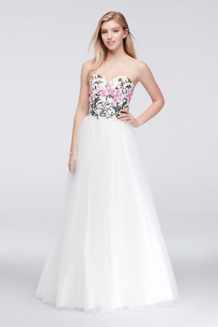 Colorfully embroidered wildflowers bloom beautifully from the lace-up bodice of this tulle ball gown. This style is exclusive to David's Bridal.