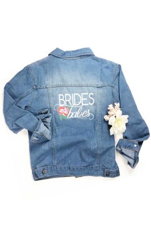 Bride's Babes is embroidered across the back of this fitted, distressed denim jacket, making it the perfect outerwear for your bachelorette and wedding weekend wardrobes. Jacket is fitted; size up for looser fit.