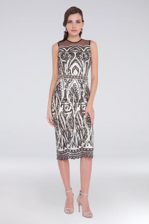 Elaborate embroidery, highlighted by sequins, patterns this knee-length sheath cocktail dress. The illusion neckline and scalloped hem add extra detail.