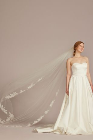 Detailed with luxe embroidered appliques and three different types of lace, this elegant tulle veil is truly a showpiece.
