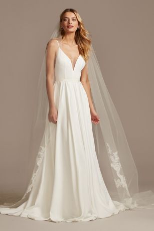 The perfect complement to any wedding dress, this cathedral length veil is framed with embroidered floral appliques and a delicate scalloped trim.