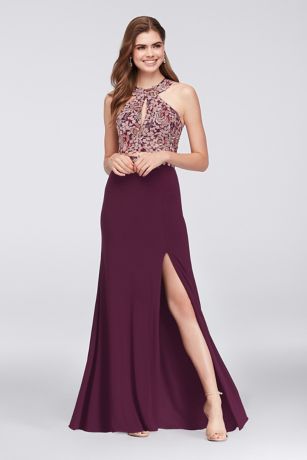Embroidered, beaded flowers bloom like a garden on the round-neck halter crop top of this two-piece dress. The floral detail continues at the waistband of the slit, stretch-jersey skirt.