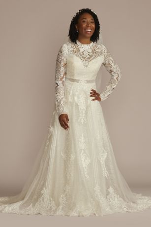 Ornate lace and floral applique is layered atop illusion mesh and tulle to form this modern heirloom wedding dress. The vintage-inspired appliques create a high mock neckline, while eyelash-trimmed scallops adorn the cap sleeves and A-line skirt. Finished with a chapel train.