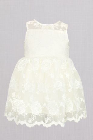 Embroidered roses bloom atop this pretty-as-can-be flower girl dress, while a flower embellishment adds playful detail to the waist.