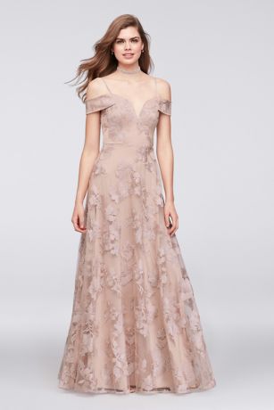 Embroidered Mesh Off-the-Shoulder A-Line Gown