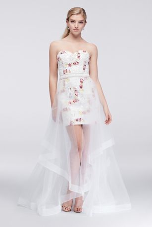 Why choose between a fun mini or a sophisticated ball gown? This richly embroidered sheath mini dress is covered by a cascading, horsehair-edged organza skirt for the best of both worlds. This style is exclusive to David's Bridal.