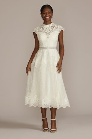 Embroidered Mock Neck Tea-Length Wedding Dress
