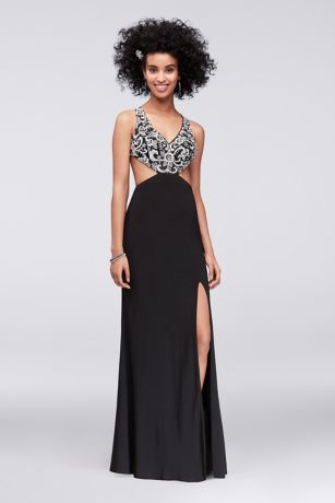 Dare to make a statement in this plunging, cutout matte jersey gown. Beaded embroidery provides sparkling, ornate detail.