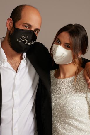 This his and hers set of fashion face masks are ready to celebrate (safely, of course!). Features a white satin mask, embroidered in metallic script with "Bride," and a black satin mask, embroidered in a metallic script with "Groom."