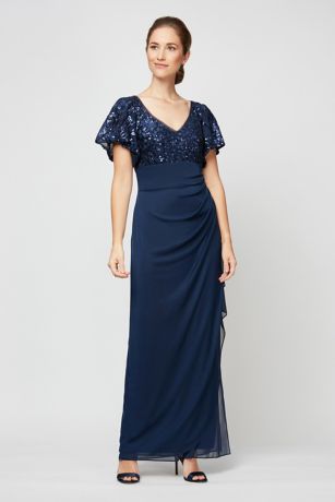 You'll look runway-ready in this long sheath dress, featuring a sequin-embroidered bodice, flutter sleeves, and a cascade skirt.