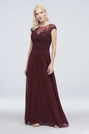 A beautifully detailed dress for the mother of the bride or groom, featuring an illusion scoop neckline, a beaded and embroidered bodice, and a flowy jersey chiffon skirt.