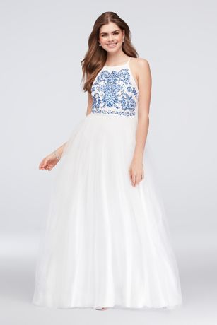 Blue floral embroidery makes a delicate impression on the high-neck bodice of this tulle ball gown. A strappy back finishes the look.