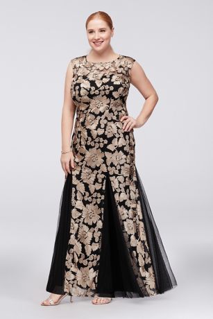 Topped with illusion cap sleeves, this gorgeous stretch tulle plus size evening gown features ornate floral embroidery and godet insets at the hemline for graceful movement.