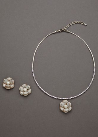 A simple yet elegant look for your girls on your big day. Revello collar necklace has mini pearl and crystal accents in the form of a flower - earrings match the flower detail on the necklace.