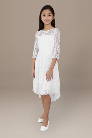 Demure lace three-quarter sleeves are a sweet option for any young lady, adding both style and modesty. A fun high-low skirt highlights the flower girl's playful personality (and shows off her fabulous shoes)!