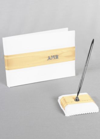Stylish white or ivory satin guest book is adorned with layered satin panel in your choice of many David's Exclusive Colors.  Three rhinestone monogram charms adds a personalized touch. Comes complete with coordinating pen set.