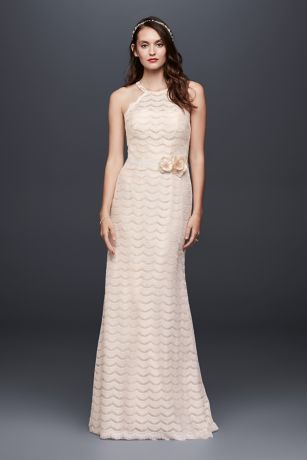 Delicate, fringy scallops of eyelash lace create this slim sheath wedding gown's unique texture. A keyhole back and 3D floral sash add extra detail to the simple silhouette.