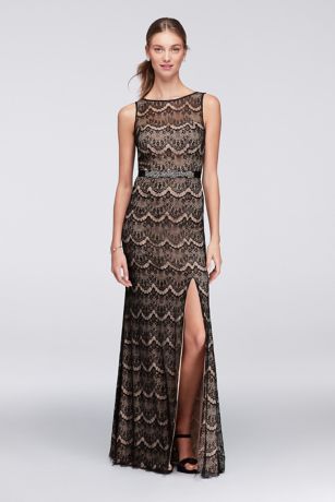 Delicately woven lace culminates in soft fringe at the hemline of this illusion-bodice sheath gown. A beaded grosgrain ribbon waistband adds the perfect finishing touch.