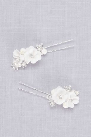 Add some polish to your updo with this set of two classic hair pins, featuring fabric flowers and petite pearls.