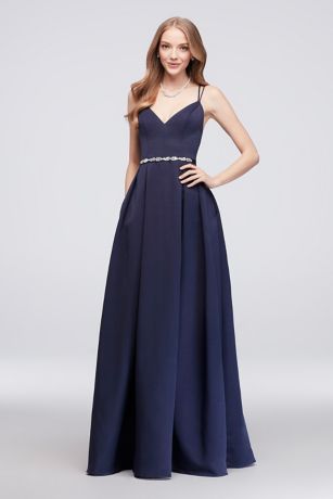 Double spaghetti straps and a V-neckline top this faille bridesmaid ball gown. A removable crystal-embellished grosgrain sash lets you go with shimmer or without.