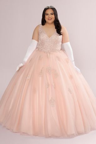 This ethereal quinceanera ballgown feels like it was lifted out of a fairytale! Nearly 100 embellished lace appliques are used in the V-neck lace bodice with illusion tank straps and are also scattered throughout the soft, flowy skirt.