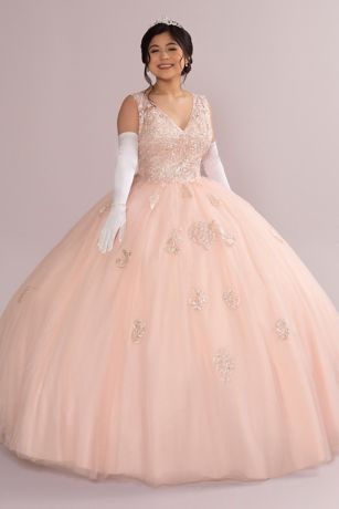 This ethereal quinceanera ballgown feels like it was lifted out of a fairytale! Nearly 100 embellished lace appliques are used in the V-neck lace bodice with illusion tank straps and are also scattered throughout the soft, flowy skirt.