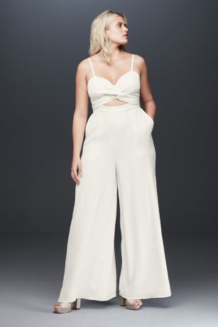 This versatile crepe jumpsuit features two large ties at the bodice that can be crossed around the bodice, tied in a bow, or wrapped to your preference! The chic wide-leg pants have side pockets, perfect for stashing your lipstick. From Fame and Partners x David's Bridal.