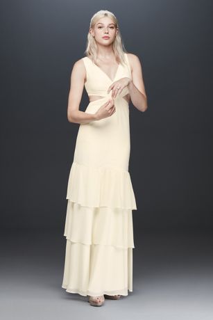 Effortless and elegant, this loosely draped, plunging V-neck georgette dress is perfect for the boho bride. The cutout waist, which creates an open back detail and meets at the center of the bodice, enhances an hourglass silhouette, while the flowy tiered skirt adds dimension. From Fame and Partners x David's Bridal.