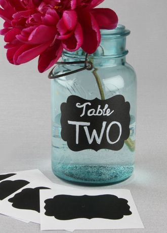 Customize and label the details of your wedding with these fancy shaped chalkboard stickers. The possibilities are endless with a blank slate. Use as table numbers or to label desserts and drinks, on vintage finds or new treasures. Labels are vinyl, wipe clean and are easily removed. Glass jar not included.