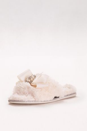 Faux-Fur Slippers with Jeweled Ribbon Bow