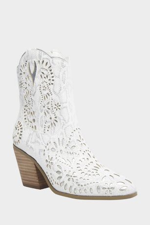 These cowboy boots were made for....showing off! A subtle faux snake print layer embellished with floral cutouts and dotted patterns sits atop a metallic layer.