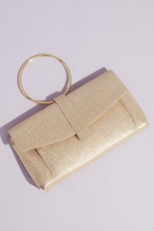 Add a bit of dazzle to your look with this metallic, faux-snakeskin clutch, topped with a cool ring handle.