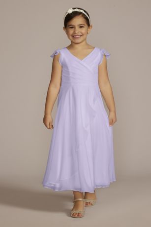 Sweet flutter sleeves, a gathered surplice bodice, and a long, flowy chiffon skirt come together to create this simply elegant flower girl dress. Mini magic! This style is available in infant and toddler sizes.
