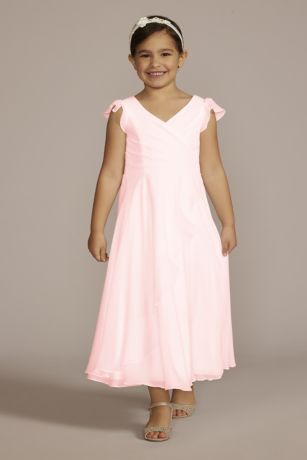 Sweet flutter sleeves, a gathered surplice bodice, and a long, flowy chiffon skirt come together to create this simply elegant flower girl dress. Mini magic! This style is available in infant and toddler sizes.