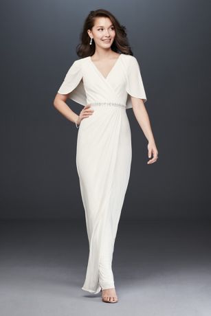 No need for extra accessories: This jersey gown features a capelet along the back and a faux-wrap bodice, cinched at the waist with an embellished sash.