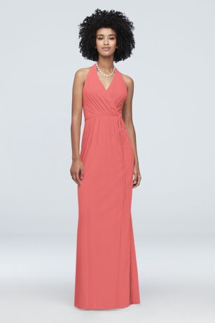 A halter neckline and faux-wrap silhouette add retro appeal to this long mesh bridesmaid dress.