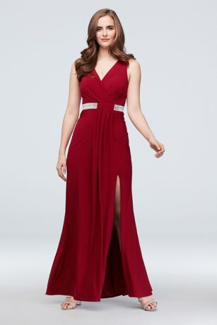 This floor-length jersey gown is the height of chic sophistication. A luxurious crystal belt cinches the waist between a faux wrap-style bodice and a cascading skirt, accented with a slit.