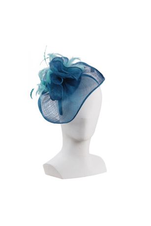 A rose-like gathering of sinamay straw and feathers tops this fun fascinator headband.