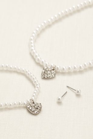 - Single row of pearls with rhinestone heart charm on necklace and bracelet.