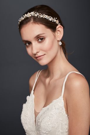 Add a vintage-inspired finishing touch to your look with this leafy headband, topped with crystals and pearls, and centered by a filigree blossom.
