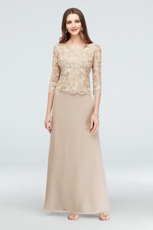 Scrolling filigree lace embellishes the 3/4-sleeve top of this long, soft tulle dress.