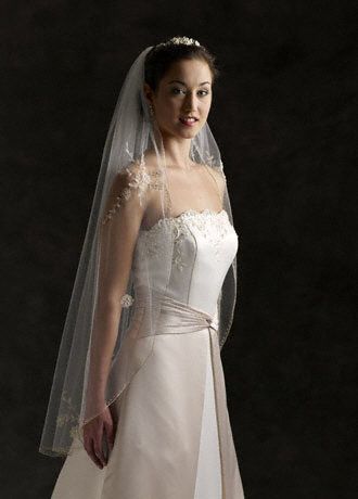 This elegant one-tier veil features a metallic pencil edge and delicate lace embroidered flowers. The fingertip length measures approximately 40 inches long by 72" wide. Wire comb. Available in White or Ivory. To care for your veil, hang and steam. Imported.