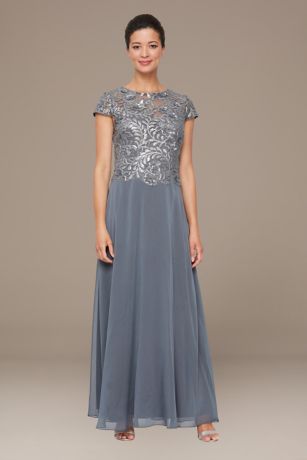 Floor Length Embroidered Sequin Cap Sleeve Dress