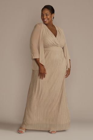 With metallic fabric that shines so bright, this V-neck tank sheath dress is a sophisticated choice for any mother of the bride or groom. The three-quarter sleeve ruffled mesh jacket provides chic coverage.