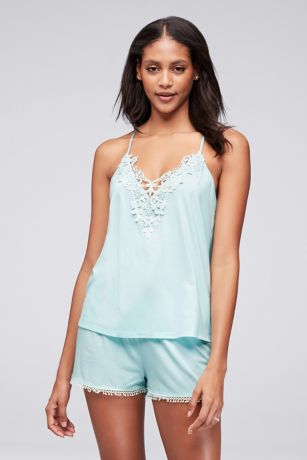 A slinky crochet-trimmed jersey cami and matching tap shorts makes for cute wedding-morning lounging and honeymoon snoozing.