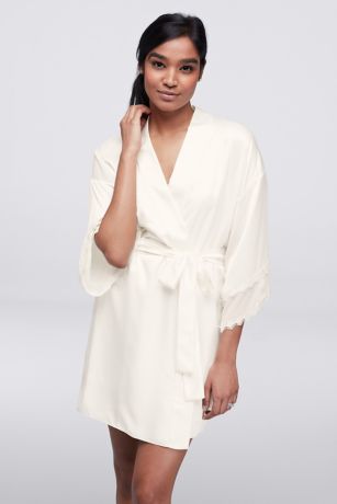 A classic honeymoon cover-up, this flowing crepe robe is sweetly trimmed in lace at the sleeves.